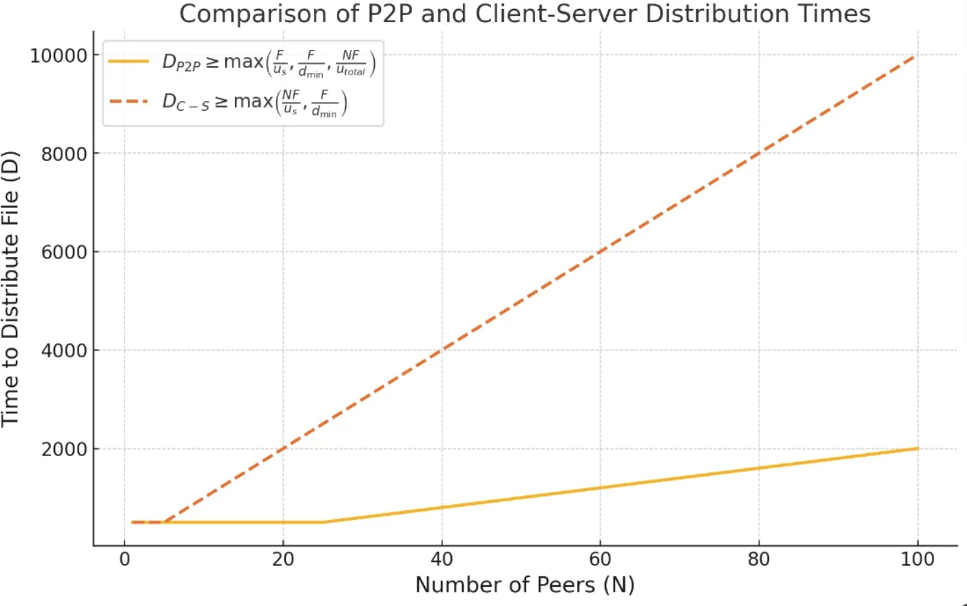 - 만약 서버가 N 피어에게 F의 사이즈를 가진 파일들을 모두 전송해야하는 데 걸리는 시간을 측정한다고 하자.