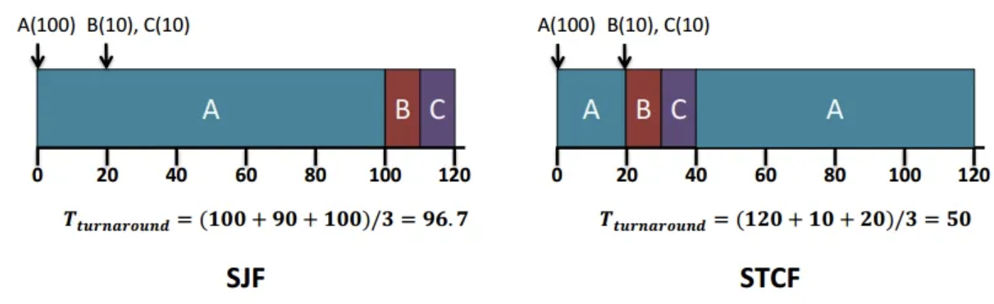 - 만약 나중에 도착한 job의 run time이 현재 job의 remain time보다 작다면, preempt한다.