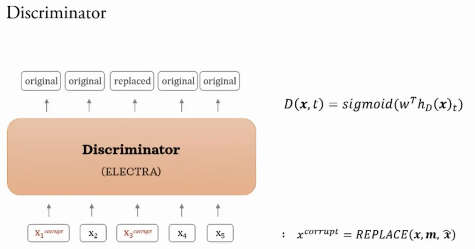 모델이 실제 입력 토큰과 그럴싸한 가짜 토큰을 구별하도록 하는 사전 학습 작업을 수행하는 것이다.