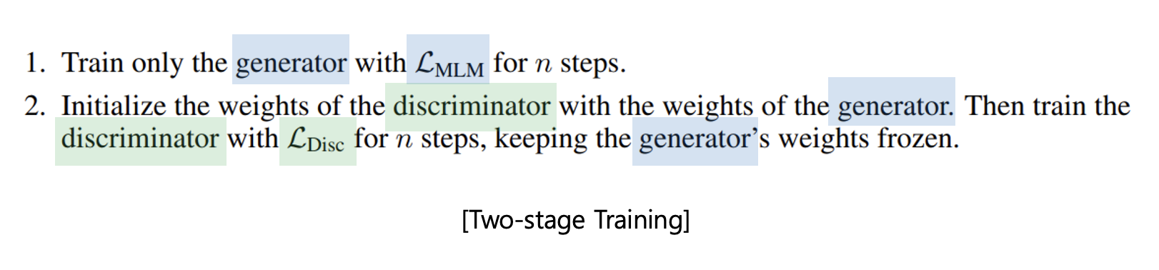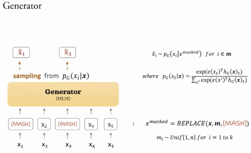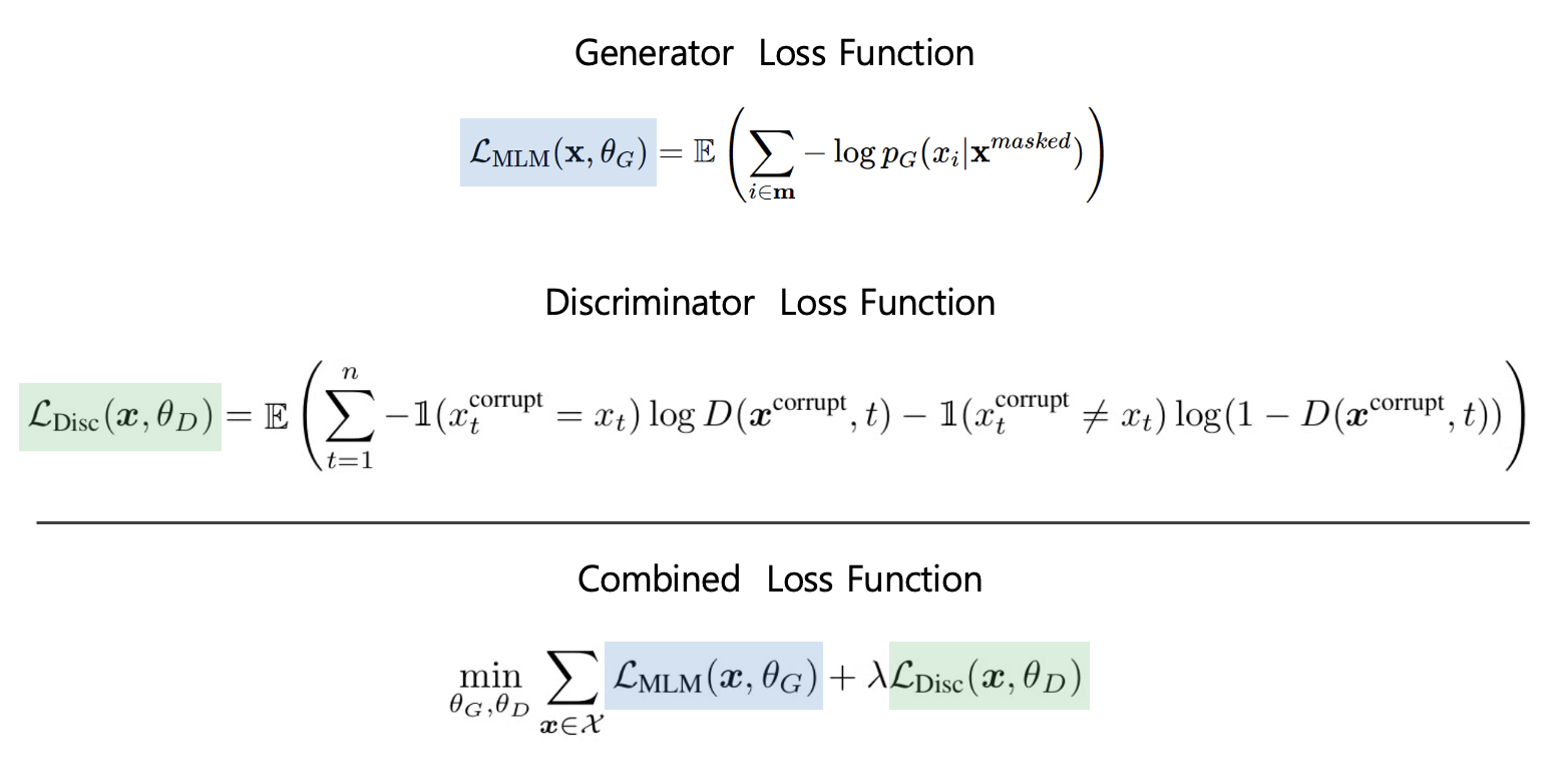 - Generator의 Loss function에서는, masked된 입력 x^masked에 대하여 마스크된 위치 i에 있는 토큰을 예측한다. 이 손실 함수는 마스크된 토큰에 대한 예측 확률의 로그값을 최소화하여 Generator가 마스크된 토큰을 올바르게 복원하도록 학습한다.