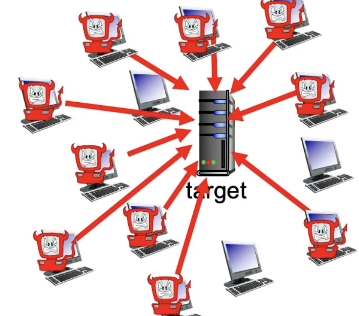 - 감염된 호스트를 이용한 패킷 전송: 공격자는 감염된 여러 호스트로부터 대량의 패킷을 목표 서버로 전송한다. 이러한 트래픽은 합법적인 트래픽처럼 보이지만, 실제로는 서버를 과부하시키기 위한 위조 트래픽이다. 이로 인해 서버는 과부하가 걸려 정상적인 사용자가 자원을 사용할 수 없게 된다.